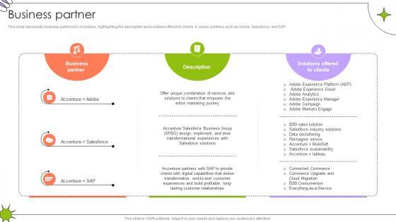 This slide represents business partners for Accenture, highlighting the description and solutions offered to clients. It covers partners such as Adobe, Salesforce, and SAP.Slidegeeks is one of the best resources for PowerPoint templates. You can download easily and regulate Business Partner Global Innovation And Business Solutions Company Profile CP SS V for your personal presentations from our wonderful collection. A few clicks is all it takes to discover and get the most relevant and appropriate templates. Use our Templates to add a unique zing and appeal to your presentation and meetings. All the slides are easy to edit and you can use them even for advertisement purposes. This slide represents business partners for Accenture, highlighting the description and solutions offered to clients. It covers partners such as Adobe, Salesforce, and SAP.