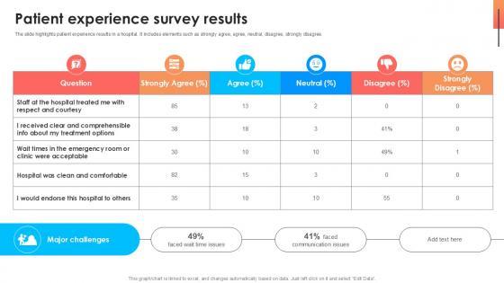 The slide highlights patient experience results in a hospital. It includes elements such as strongly agree, agree, neutral, disagree, strongly disagree. Whether you have daily or monthly meetings, a brilliant presentation is necessary. Patient Experience Survey Results Comprehensive Approach To Strategic Planning Ppt Presentation can be your best option for delivering a presentation. Represent everything in detail using Patient Experience Survey Results Comprehensive Approach To Strategic Planning Ppt Presentation and make yourself stand out in meetings. The template is versatile and follows a structure that will cater to your requirements. All the templates prepared by Slidegeeks are easy to download and edit. Our research experts have taken care of the corporate themes as well. So, give it a try and see the results. The slide highlights patient experience results in a hospital. It includes elements such as strongly agree, agree, neutral, disagree, strongly disagree.