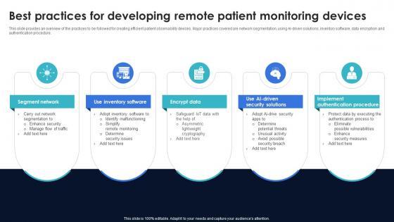 This slide provides an overview of the practices to be followed for creating efficient patient observability devices. Major practices covered are network segmentation, using AI-driven solutions, inventory software, data encryption and authentication procedure. Present like a pro with Optimization Of IoT Remote Monitoring Best Practices For Developing Remote Patient Monitoring IoT SS V. Create beautiful presentations together with your team, using our easy-to-use presentation slides. Share your ideas in real-time and make changes on the fly by downloading our templates. So whether you are in the office, on the go, or in a remote location, you can stay in sync with your team and present your ideas with confidence. With Slidegeeks presentation got a whole lot easier. Grab these presentations today. This slide provides an overview of the practices to be followed for creating efficient patient observability devices. Major practices covered are network segmentation, using AI-driven solutions, inventory software, data encryption and authentication procedure.