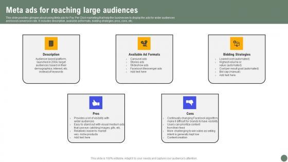 This slide provides glimpse about using Meta ads for Pay Per Click marketing that help the businesses to display the ads for wider audiences and boost conversion rate. It includes description, available ad formats, bidding strategies, pros, cons, etc. This Meta Ads For Reaching Large Exhaustive Guide Of Pay Per Click Advertising Initiatives Guidelines Pdf is perfect for any presentation, be it in front of clients or colleagues. It is a versatile and stylish solution for organizing your meetings. The Meta Ads For Reaching Large Exhaustive Guide Of Pay Per Click Advertising Initiatives Guidelines Pdf features a modern design for your presentation meetings. The adjustable and customizable slides provide unlimited possibilities for acing up your presentation. Slidegeeks has done all the homework before launching the product for you. So, do not wait, grab the presentation templates today This slide provides glimpse about using Meta ads for Pay Per Click marketing that help the businesses to display the ads for wider audiences and boost conversion rate. It includes description, available ad formats, bidding strategies, pros, cons, etc.