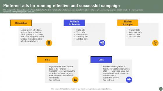 This slide provides glimpse about using Pinterest ads for Pay Per Click marketing that help the businesses to display the ads in front of people who have high purchase intent. It includes description, available ad formats, bidding strategies, pros, cons, etc. Are you searching for a Pinterest Ads For Running Effective Exhaustive Guide Of Pay Per Click Advertising Initiatives Download Pdf that is uncluttered, straightforward, and original Its easy to edit, and you can change the colors to suit your personal or business branding. For a presentation that expresses how much effort you have put in, this template is ideal With all of its features, including tables, diagrams, statistics, and lists, its perfect for a business plan presentation. Make your ideas more appealing with these professional slides. Download Pinterest Ads For Running Effective Exhaustive Guide Of Pay Per Click Advertising Initiatives Download Pdf from Slidegeeks today. This slide provides glimpse about using Pinterest ads for Pay Per Click marketing that help the businesses to display the ads in front of people who have high purchase intent. It includes description, available ad formats, bidding strategies, pros, cons, etc.