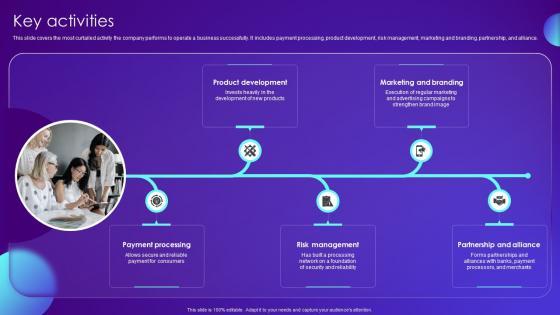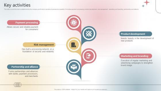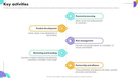 This slide covers the most curtailed activity the company performs to operate a business successfully. It includes payment processing, product development, risk management, marketing and branding, partnership, and alliance. Get a simple yet stunning designed Key Activities Payment Processing Company Business Model BMC SS V. It is the best one to establish the tone in your meetings. It is an excellent way to make your presentations highly effective. So, download this PPT today from Slidegeeks and see the positive impacts. Our easy-to-edit Key Activities Payment Processing Company Business Model BMC SS V can be your go-to option for all upcoming conferences and meetings. So, what are you waiting for Grab this template today. This slide covers the most curtailed activity the company performs to operate a business successfully. It includes payment processing, product development, risk management, marketing and branding, partnership, and alliance.