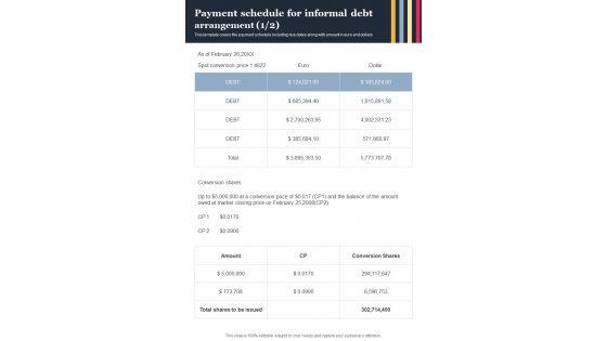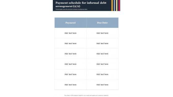 Presenting you an exemplary Payment Schedule For Informal Debt Arrangement One Pager Sample Example Document. Our one-pager comprises all the must-have essentials of an inclusive document. You can edit it with ease, as its layout is completely editable. With such freedom, you can tweak its design and other elements to your requirements. Download this Payment Schedule For Informal Debt Arrangement One Pager Sample Example Document brilliant piece now. Our Payment Schedule For Informal Debt Arrangement One Pager Sample Example Document are topically designed to provide an attractive backdrop to any subject. Use them to look like a presentation pro.