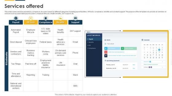 This slide covers services provided by company to its users based on different categories including payroll facilities, HR tools, compliance, benefits and constant support. The purpose of this template is to provide an overview on services such as automated payroll system, employee lifecycle, health benefits, 24 or 7 support, etc. This modern and well-arranged Services Offered Payroll Solutions Provider Investor Funding Elevator Pitch Deck provides lots of creative possibilities. It is very simple to customize and edit with the Powerpoint Software. Just drag and drop your pictures into the shapes. All facets of this template can be edited with Powerpoint, no extra software is necessary. Add your own material, put your images in the places assigned for them, adjust the colors, and then you can show your slides to the world, with an animated slide included. This slide covers services provided by company to its users based on different categories including payroll facilities, HR tools, compliance, benefits and constant support. The purpose of this template is to provide an overview on services such as automated payroll system, employee lifecycle, health benefits, 24 or 7 support, etc.