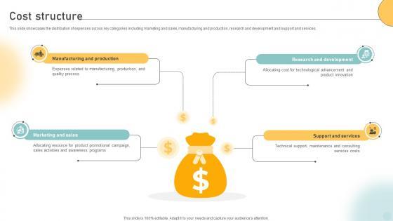This slide showcases the distribution of expenses across key categories including marketing and sales, manufacturing and production, research and development and support and services. Create an editable Cost Structure Pc Manufacturing Company Business Model BMC SS V that communicates your idea and engages your audience. Whether you are presenting a business or an educational presentation, pre-designed presentation templates help save time. Cost Structure Pc Manufacturing Company Business Model BMC SS V is highly customizable and very easy to edit, covering many different styles from creative to business presentations. Slidegeeks has creative team members who have crafted amazing templates. So, go and get them without any delay. This slide showcases the distribution of expenses across key categories including marketing and sales, manufacturing and production, research and development and support and services.