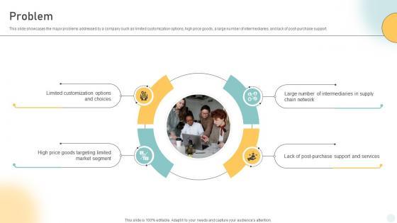 This slide showcases the major problems addressed by a company such as limited customization options, high price goods, a large number of intermediaries, and lack of post-purchase support. Whether you have daily or monthly meetings, a brilliant presentation is necessary. Problem Pc Manufacturing Company Business Model BMC SS V can be your best option for delivering a presentation. Represent everything in detail using Problem Pc Manufacturing Company Business Model BMC SS V and make yourself stand out in meetings. The template is versatile and follows a structure that will cater to your requirements. All the templates prepared by Slidegeeks are easy to download and edit. Our research experts have taken care of the corporate themes as well. So, give it a try and see the results. This slide showcases the major problems addressed by a company such as limited customization options, high price goods, a large number of intermediaries, and lack of post-purchase support.