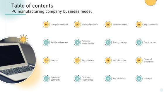 If you are looking for a format to display your unique thoughts, then the professionally designed Table Of Contents Pc Manufacturing Company Business Model BMC SS V is the one for you. You can use it as a Google Slides template or a PowerPoint template. Incorporate impressive visuals, symbols, images, and other charts. Modify or reorganize the text boxes as you desire. Experiment with shade schemes and font pairings. Alter, share or cooperate with other people on your work. Download Table Of Contents Pc Manufacturing Company Business Model BMC SS V and find out how to give a successful presentation. Present a perfect display to your team and make your presentation unforgettable. Our Table Of Contents Pc Manufacturing Company Business Model BMC SS V are topically designed to provide an attractive backdrop to any subject. Use them to look like a presentation pro.
