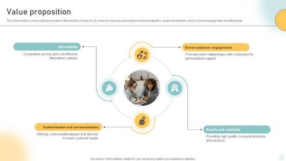 This slide exhibits a unique selling proposition offered by the company to its customers such as customization and personalization, quality and reliability, direct customer engagement, and affordability. Are you in need of a template that can accommodate all of your creative concepts This one is crafted professionally and can be altered to fit any style. Use it with Google Slides or PowerPoint. Include striking photographs, symbols, depictions, and other visuals. Fill, move around, or remove text boxes as desired. Test out color palettes and font mixtures. Edit and save your work, or work with colleagues. Download Value Proposition Pc Manufacturing Company Business Model BMC SS V and observe how to make your presentation outstanding. Give an impeccable presentation to your group and make your presentation unforgettable. This slide exhibits a unique selling proposition offered by the company to its customers such as customization and personalization, quality and reliability, direct customer engagement, and affordability.