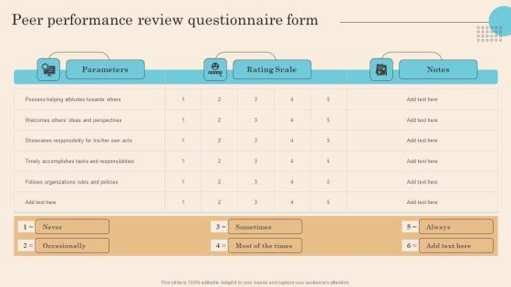 Coming up with a presentation necessitates that the majority of the effort goes into the content and the message you intend to convey. The visuals of a PowerPoint presentation can only be effective if it supplements and supports the story that is being told. Keeping this in mind our experts created Peer Performance Review Questionnaire Form Microsoft PDF to reduce the time that goes into designing the presentation. This way, you can concentrate on the message while our designers take care of providing you with the right template for the situation.