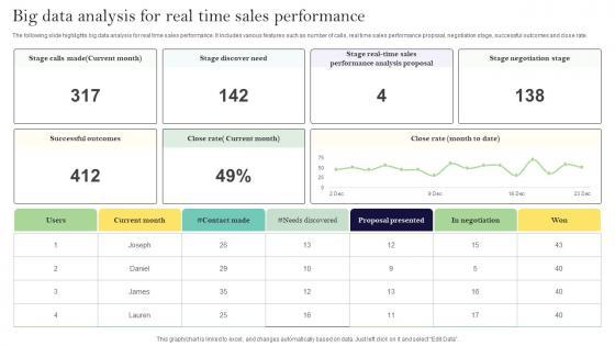 The following slide highlights big data analysis for real time sales performance. It includes various features such as number of calls, real time sales performance proposal, negotiation stage, successful outcomes and close rate. Showcasing this set of slides titled Big Data Analysis For Real Time Sales Performance Ppt Show Format Ideas Pdf. The topics addressed in these templates are Negotiation Stage, Successful Outcomes, Close Rate. All the content presented in this PPT design is completely editable. Download it and make adjustments in color, background, font etc. as per your unique business setting. The following slide highlights big data analysis for real time sales performance. It includes various features such as number of calls, real time sales performance proposal, negotiation stage, successful outcomes and close rate.