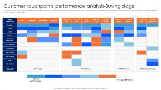 This slide represents the touchpoints performance map to analyze the performance of consumer touchpoints at the buying stage to effectively draw strategies to optimize campaign performance. It showcases performance of digital touchpoints such as website etc.Welcome to our selection of the Customer Touchpoints Performance Analysis Guide For Data Driven Advertising Formats Pdf. These are designed to help you showcase your creativity and bring your sphere to life. Planning and Innovation are essential for any business that is just starting out. This collection contains the designs that you need for your everyday presentations. All of our PowerPoints are 100Precent editable, so you can customize them to suit your needs. This multi-purpose template can be used in various situations. Grab these presentation templates today. This slide represents the touchpoints performance map to analyze the performance of consumer touchpoints at the buying stage to effectively draw strategies to optimize campaign performance. It showcases performance of digital touchpoints such as website etc.