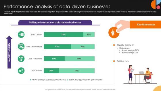 This slide depicts the performances of businesses that used data integration. The purpose of this slide is to highlight the importance of data integration as it improves business efficiency, effectiveness, and success with increasing data maturity. From laying roadmaps to briefing everything in detail, our templates are perfect for you. You can set the stage with your presentation slides. All you have to do is download these easy-to-edit and customizable templates. Performance Analysis Of Data Driven Businesses Data Integration Strategies For Business will help you deliver an outstanding performance that everyone would remember and praise you for. Do download this presentation today. This slide depicts the performances of businesses that used data integration. The purpose of this slide is to highlight the importance of data integration as it improves business efficiency, effectiveness, and success with increasing data maturity.