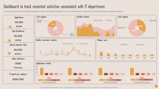 This slide provides information regarding dashboard to monitor critical activities related to IT in terms of incident tracker, outage report, IT spend per employee, application trends, etc. Find highly impressive Dashboard To Track Essential Playbook For Strategic Actions To Improve IT Performance Guidelines Pdf on Slidegeeks to deliver a meaningful presentation. You can save an ample amount of time using these presentation templates. No need to worry to prepare everything from scratch because Slidegeeks experts have already done a huge research and work for you. You need to download Dashboard To Track Essential Playbook For Strategic Actions To Improve IT Performance Guidelines Pdf for your upcoming presentation. All the presentation templates are 100 percent editable and you can change the color and personalize the content accordingly. Download now This slide provides information regarding dashboard to monitor critical activities related to IT in terms of incident tracker, outage report, IT spend per employee, application trends, etc.