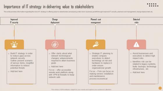 This slide provides information regarding the role of IT strategy in offering value to stakeholders and playing a vital role in business growth through improved IT security, planned cost management, change deployment, etc. This modern and well arranged Importance Of IT Strategy Delivering Playbook For Strategic Actions To Improve IT Performance Mockup Pdf provides lots of creative possibilities. It is very simple to customize and edit with the Powerpoint Software. Just drag and drop your pictures into the shapes. All facets of this template can be edited with Powerpoint, no extra software is necessary. Add your own material, put your images in the places assigned for them, adjust the colors, and then you can show your slides to the world, with an animated slide included. This slide provides information regarding the role of IT strategy in offering value to stakeholders and playing a vital role in business growth through improved IT security, planned cost management, change deployment, etc.