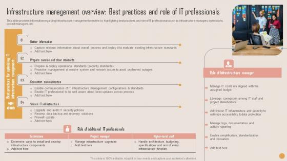 This slide provides information regarding infrastructure management overview by highlighting best practices and role of IT professionals such as infrastructure managers, technicians, project managers, etc. The best PPT templates are a great way to save time, energy, and resources. Slidegeeks have 100 percent editable powerpoint slides making them incredibly versatile. With these quality presentation templates, you can create a captivating and memorable presentation by combining visually appealing slides and effectively communicating your message. Download Infrastructure Management Playbook For Strategic Actions To Improve IT Performance Information Pdf from Slidegeeks and deliver a wonderful presentation. This slide provides information regarding infrastructure management overview by highlighting best practices and role of IT professionals such as infrastructure managers, technicians, project managers, etc.