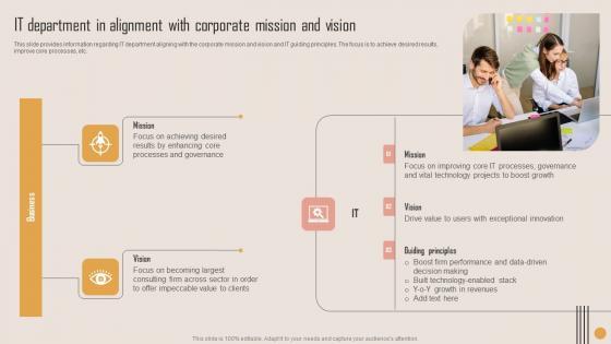 This slide provides information regarding IT department aligning with the corporate mission and vision and IT guiding principles. The focus is to achieve desired results, improve core processes, etc. Slidegeeks has constructed IT Department In Alignment Playbook For Strategic Actions To Improve IT Performance Diagrams Pdf after conducting extensive research and examination. These presentation templates are constantly being generated and modified based on user preferences and critiques from editors. Here, you will find the most attractive templates for a range of purposes while taking into account ratings and remarks from users regarding the content. This is an excellent jumping off point to explore our content and will give new users an insight into our top notch PowerPoint Templates. This slide provides information regarding IT department aligning with the corporate mission and vision and IT guiding principles. The focus is to achieve desired results, improve core processes, etc.