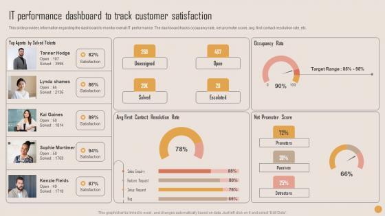 This slide provides information regarding the dashboard to monitor overall IT performance. The dashboard tracks occupancy rate, net promoter score, avg. first contact resolution rate, etc. Presenting this PowerPoint presentation, titled IT Performance Dashboard Playbook For Strategic Actions To Improve IT Performance Rules Pdf, with topics curated by our researchers after extensive research. This editable presentation is available for immediate download and provides attractive features when used. Download now and captivate your audience. Presenting this IT Performance Dashboard Playbook For Strategic Actions To Improve IT Performance Rules Pdf. Our researchers have carefully researched and created these slides with all aspects taken into consideration. This is a completely customizable IT Performance Dashboard Playbook For Strategic Actions To Improve IT Performance Rules Pdf that is available for immediate downloading. Download now and make an impact on your audience. Highlight the attractive features available with our PPTs. This slide provides information regarding the dashboard to monitor overall IT performance. The dashboard tracks occupancy rate, net promoter score, avg. first contact resolution rate, etc.