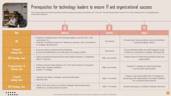 This slide provides information regarding IT professionals prerequisites to enable firm and IT success. The technology leaders include CIO, IT head, strategy team by highlighting their collaborative initiatives. Get a simple yet stunning designed Prerequisites For Technology Leaders Playbook For Strategic Actions To Improve IT Performance Pictures Pdf. It is the best one to establish the tone in your meetings. It is an excellent way to make your presentations highly effective. So, download this PPT today from Slidegeeks and see the positive impacts. Our easy to edit Prerequisites For Technology Leaders Playbook For Strategic Actions To Improve IT Performance Pictures Pdf can be your go to option for all upcoming conferences and meetings. So, what are you waiting for Grab this template today. This slide provides information regarding IT professionals prerequisites to enable firm and IT success. The technology leaders include CIO, IT head, strategy team by highlighting their collaborative initiatives.