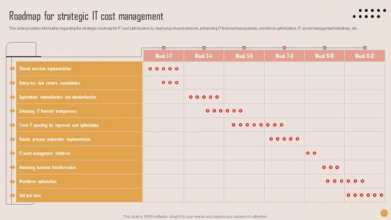 This slide provides information regarding the strategic roadmap for IT cost optimization by deploying shared services, enhancing IT financial transparency, workforce optimization, IT asset management initiatives, etc. Present like a pro with Roadmap For Strategic IT Cost Playbook For Strategic Actions To Improve IT Performance Ideas Pdf Create beautiful presentations together with your team, using our easy to use presentation slides. Share your ideas in real time and make changes on the fly by downloading our templates. So whether you are in the office, on the go, or in a remote location, you can stay in sync with your team and present your ideas with confidence. With Slidegeeks presentation got a whole lot easier. Grab these presentations today. This slide provides information regarding the strategic roadmap for IT cost optimization by deploying shared services, enhancing IT financial transparency, workforce optimization, IT asset management initiatives, etc.