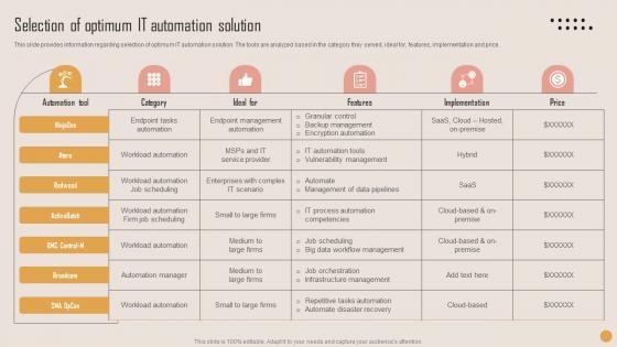This slide provides information regarding selection of optimum IT automation solution. The tools are analyzed based in the category they served, ideal for, features, implementation and price. Do you have an important presentation coming up Are you looking for something that will make your presentation stand out from the rest Look no further than Selection Of Optimum IT Playbook For Strategic Actions To Improve IT Performance Background Pdf. With our professional designs, you can trust that your presentation will pop and make delivering it a smooth process. And with Slidegeeks, you can trust that your presentation will be unique and memorable. So why wait Grab Selection Of Optimum IT Playbook For Strategic Actions To Improve IT Performance Background Pdf today and make your presentation stand out from the rest This slide provides information regarding selection of optimum IT automation solution. The tools are analyzed based in the category they served, ideal for, features, implementation and price.