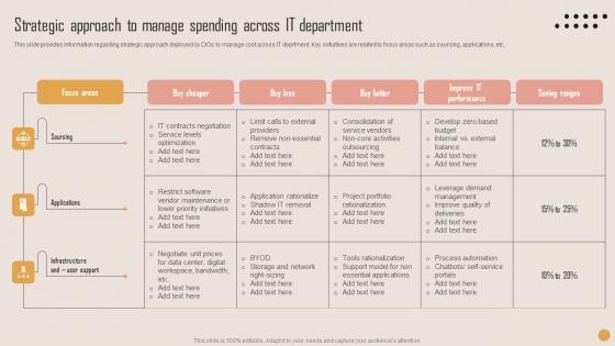 This slide provides information regarding strategic approach deployed by CIOs to manage cost across IT deprtment. Key initiatives are related to focus areas such as sourcing, applications, etc. If your project calls for a presentation, then Slidegeeks is your go to partner because we have professionally designed, easy to edit templates that are perfect for any presentation. After downloading, you can easily edit Strategic Approach To Manage Playbook For Strategic Actions To Improve IT Performance Diagrams Pdf and make the changes accordingly. You can rearrange slides or fill them with different images. Check out all the handy templates This slide provides information regarding strategic approach deployed by CIOs to manage cost across IT deprtment. Key initiatives are related to focus areas such as sourcing, applications, etc.