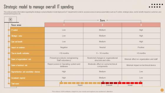 This slide provides information regarding the strategic cost prioritization model deployed by IT department in order to assess scores on various parameters such as IT control, strategic value, cost and benefit, impact on customer, and investment required, etc. Are you in need of a template that can accommodate all of your creative concepts This one is crafted professionally and can be altered to fit any style. Use it with Google Slides or PowerPoint. Include striking photographs, symbols, depictions, and other visuals. Fill, move around, or remove text boxes as desired. Test out color palettes and font mixtures. Edit and save your work, or work with colleagues. Download Strategic Model To Manage Playbook For Strategic Actions To Improve IT Performance Graphics Pdf and observe how to make your presentation outstanding. Give an impeccable presentation to your group and make your presentation unforgettable. This slide provides information regarding the strategic cost prioritization model deployed by IT department in order to assess scores on various parameters such as IT control, strategic value, cost and benefit, impact on customer, and investment required, etc.