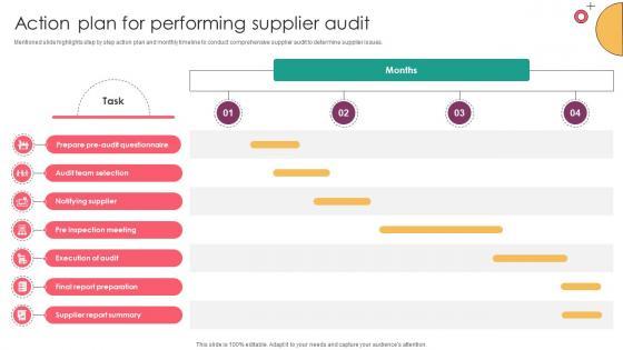Mentioned slide highlights step by step action plan and monthly timeline to conduct comprehensive supplier audit to determine supplier issues. Create an editable Strategic Supplier Evaluation Action Plan For Performing Supplier Audit that communicates your idea and engages your audience. Whether you are presenting a business or an educational presentation, pre-designed presentation templates help save time. Strategic Supplier Evaluation Action Plan For Performing Supplier Audit is highly customizable and very easy to edit, covering many different styles from creative to business presentations. Slidegeeks has creative team members who have crafted amazing templates. So, go and get them without any delay. Mentioned slide highlights step by step action plan and monthly timeline to conduct comprehensive supplier audit to determine supplier issues.