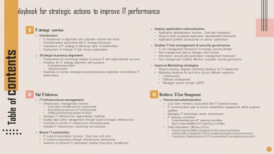 Do you have to make sure that everyone on your team knows about any specific topic I yes, then you should give Playbook For Strategic Actions To Improve IT Performance Table Of Contents Diagrams Pdf a try. Our experts have put a lot of knowledge and effort into creating this impeccable Playbook For Strategic Actions To Improve IT Performance Table Of Contents Diagrams Pdf. You can use this template for your upcoming presentations, as the slides are perfect to represent even the tiniest detail. You can download these templates from the Slidegeeks website and these are easy to edit. So grab these today Our Playbook For Strategic Actions To Improve IT Performance Table Of Contents Diagrams Pdf are topically designed to provide an attractive backdrop to any subject. Use them to look like a presentation pro.