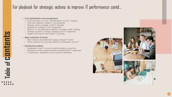 Make sure to capture your audiences attention in your business displays with our gratis customizable Table Of Contents For Playbook For Strategic Actions To Improve IT Performance Graphics Pdf. These are great for business strategies, office conferences, capital raising or task suggestions. If you desire to acquire more customers for your tech business and ensure they stay satisfied, create your own sales presentation with these plain slides. Our Table Of Contents For Playbook For Strategic Actions To Improve IT Performance Graphics Pdf are topically designed to provide an attractive backdrop to any subject. Use them to look like a presentation pro.