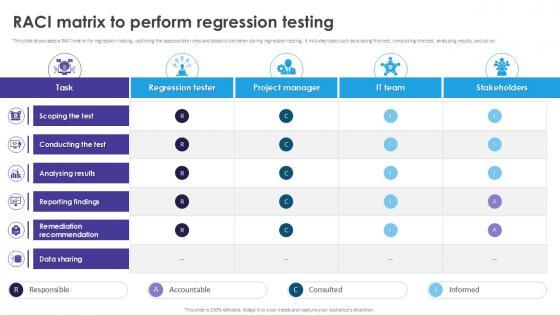 This slide showcases a RACI matrix for regression testing, outlining the appropriate roles and steps to be taken during regression testing. It includes tasks such as scoping the test, conducting the test, analysing results, and so on. Crafting an eye-catching presentation has never been more straightforward. Let your presentation shine with this tasteful yet straightforward Raci Matrix To Perform Automated Regression Testing And Achieving PPT Slide template. It offers a minimalistic and classy look that is great for making a statement. The colors have been employed intelligently to add a bit of playfulness while still remaining professional. Construct the ideal Raci Matrix To Perform Automated Regression Testing And Achieving PPT Slide that effortlessly grabs the attention of your audience Begin now and be certain to wow your customers This slide showcases a RACI matrix for regression testing, outlining the appropriate roles and steps to be taken during regression testing. It includes tasks such as scoping the test, conducting the test, analysing results, and so on.