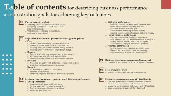 Formulating a presentation can take up a lot of effort and time, so the content and message should always be the primary focus. The visuals of the PowerPoint can enhance the presenters message, so our Table Of Contents For Describing Business Performance Administration Goals For Achieving Introduction Pdf was created to help save time. Instead of worrying about the design, the presenter can concentrate on the message while our designers work on creating the ideal templates for whatever situation is needed. Slidegeeks has experts for everything from amazing designs to valuable content, we have put everything into Table Of Contents For Describing Business Performance Administration Goals For Achieving Key Outcomes Introduction Pdf Our Table Of Contents For Describing Business Performance Administration Goals For Achieving Introduction Pdf are topically designed to provide an attractive backdrop to any subject. Use them to look like a presentation pro.