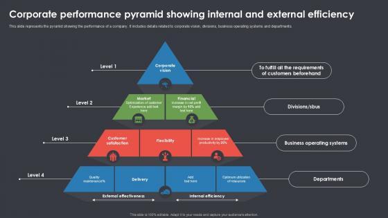 This slide represents the pyramid showing the performance of a company. It includes details related to corporate vision, divisions, business operating systems and departments . Persuade your audience using this Corporate Performance Pyramid Showing Internal And External Efficiency Brochure PDF. This PPT design covers four stages, thus making it a great tool to use. It also caters to a variety of topics including Flexibility, Customer Satisfaction, Financial. Download this PPT design now to present a convincing pitch that not only emphasizes the topic but also showcases your presentation skills.