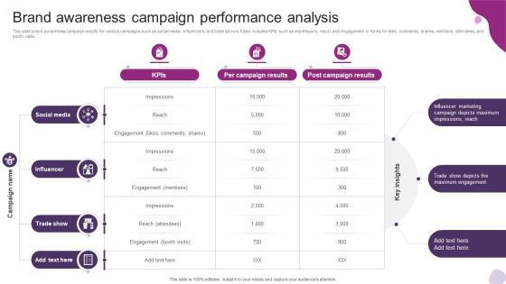 This slide brand awareness campaign results for various campaigns such as social media, influencers, and trade shows. It also includes KPIs such as impressions, reach, and engagement in forms for likes, comments, shares, mentions, attendees, and booth visits. Slidegeeks is one of the best resources for PowerPoint templates. You can download easily and regulate Brand Awareness Campaign Performance Analysis Powerful Marketing Techniques Strategy SS V for your personal presentations from our wonderful collection. A few clicks is all it takes to discover and get the most relevant and appropriate templates. Use our Templates to add a unique zing and appeal to your presentation and meetings. All the slides are easy to edit and you can use them even for advertisement purposes. This slide brand awareness campaign results for various campaigns such as social media, influencers, and trade shows. It also includes KPIs such as impressions, reach, and engagement in forms for likes, comments, shares, mentions, attendees, and booth visits.