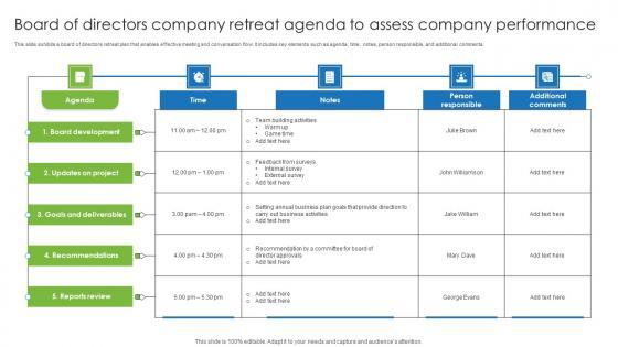 This slide exhibits a board of directors retreat plan that enables effective meeting and conversation flow. It includes key elements such as agenda, time, notes, person responsible, and additional comments Showcasing this set of slides titled Board Of Directors Company Retreat Agenda To Assess Company Performance Professional Pdf. The topics addressed in these templates are Agenda, Board Development, Updates On Project. All the content presented in this PPT design is completely editable. Download it and make adjustments in color, background, font etc. as per your unique business setting. This slide exhibits a board of directors retreat plan that enables effective meeting and conversation flow. It includes key elements such as agenda, time, notes, person responsible, and additional comments