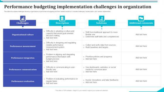 This slide showcases challenges faced by organizations in performance budgeting and their needed solutions. It includes challenges, its description, and solution implemented.Pitch your topic with ease and precision using this Performance Budgeting Implementation Challenges In Organization Microsoft Pdf This layout presents information on Performance Measurement, Performance Integration, Performance Communication It is also available for immediate download and adjustment. So, changes can be made in the color, design, graphics or any other component to create a unique layout. This slide showcases challenges faced by organizations in performance budgeting and their needed solutions. It includes challenges, its description, and solution implemented.