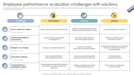 This slide showcases various challenges of employee performance evaluation along with solutions to mitigate risk. It includes challenges such as lack of objective criteria, inadequate feedback mechanisms, time and resource constraints etc. This Skill Enhancement Performance Employee Performance Evaluation Challenges With Solutions from Slidegeeks makes it easy to present information on your topic with precision. It provides customization options, so you can make changes to the colors, design, graphics, or any other component to create a unique layout. It is also available for immediate download, so you can begin using it right away. Slidegeeks has done good research to ensure that you have everything you need to make your presentation stand out. Make a name out there for a brilliant performance. This slide showcases various challenges of employee performance evaluation along with solutions to mitigate risk. It includes challenges such as lack of objective criteria, inadequate feedback mechanisms, time and resource constraints etc.