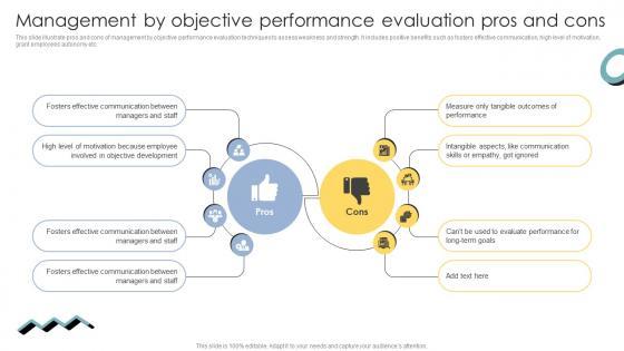 This slide illustrate pros and cons of management by objective performance evaluation techniques to assess weakness and strength. It includes positive benefits such as fosters effective communication, high level of motivation, grant employees autonomy etc. From laying roadmaps to briefing everything in detail, our templates are perfect for you. You can set the stage with your presentation slides. All you have to do is download these easy-to-edit and customizable templates. Skill Enhancement Performance Management By Objective Performance Evaluation Pros And Cons will help you deliver an outstanding performance that everyone would remember and praise you for. Do download this presentation today. This slide illustrate pros and cons of management by objective performance evaluation techniques to assess weakness and strength. It includes positive benefits such as fosters effective communication, high level of motivation, grant employees autonomy etc.