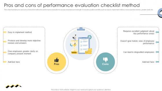 This slide illustrate pros and cons of checklist method for performance evaluation to assess weakness and strength. It includes positive benefits such as easy to implement method, more objective reviews, greater clarity etc. This modern and well-arranged Skill Enhancement Performance Pros And Cons Of Performance Evaluation Checklist Method provides lots of creative possibilities. It is very simple to customize and edit with the Powerpoint Software. Just drag and drop your pictures into the shapes. All facets of this template can be edited with Powerpoint, no extra software is necessary. Add your own material, put your images in the places assigned for them, adjust the colors, and then you can show your slides to the world, with an animated slide included. This slide illustrate pros and cons of checklist method for performance evaluation to assess weakness and strength. It includes positive benefits such as easy to implement method, more objective reviews, greater clarity etc.