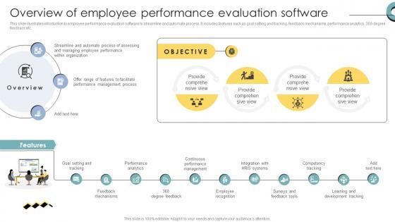 This slide illustrates introduction to employee performance evaluation software to streamline and automate process. It includes features such as goal setting and tracking, feedback mechanisms, performance analytics, 360-degree feedback etc. Present like a pro with Overview Of Employee Performance Evaluation Software Skill Enhancement Performance. Create beautiful presentations together with your team, using our easy-to-use presentation slides. Share your ideas in real-time and make changes on the fly by downloading our templates. So whether you are in the office, on the go, or in a remote location, you can stay in sync with your team and present your ideas with confidence. With Slidegeeks presentation got a whole lot easier. Grab these presentations today. This slide illustrates introduction to employee performance evaluation software to streamline and automate process. It includes features such as goal setting and tracking, feedback mechanisms, performance analytics, 360-degree feedback etc.