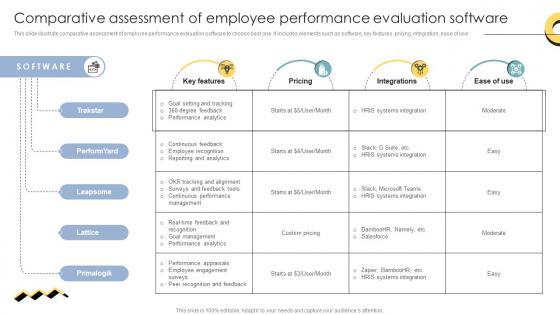 This slide illustrate comparative assessment of employee performance evaluation software to choose best one. It includes elements such as software, key features, pricing, integration, ease of use. Explore a selection of the finest Skill Enhancement Performance Comparative Assessment Of Employee Performance Evaluation Software here. With a plethora of professionally designed and pre-made slide templates, you can quickly and easily find the right one for your upcoming presentation. You can use our Skill Enhancement Performance Comparative Assessment Of Employee Performance Evaluation Software to effectively convey your message to a wider audience. Slidegeeks has done a lot of research before preparing these presentation templates. The content can be personalized and the slides are highly editable. Grab templates today from Slidegeeks. This slide illustrate comparative assessment of employee performance evaluation software to choose best one. It includes elements such as software, key features, pricing, integration, ease of use