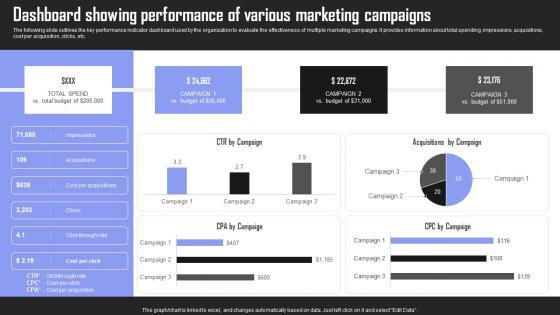 The following slide outlines the key performance indicator dashboard used by the organization to evaluate the effectiveness of multiple marketing campaigns. It provides information about total spending, impressions, acquisitions, cost per acquisition, clicks, etc. If your project calls for a presentation, then Slidegeeks is your go to partner because we have professionally designed, easy to edit templates that are perfect for any presentation. After downloading, you can easily edit Dashboard Showing Performance Brand Building Techniques To Gain Competitive Edge Topics Pdf and make the changes accordingly. You can rearrange slides or fill them with different images. Check out all the handy templates The following slide outlines the key performance indicator dashboard used by the organization to evaluate the effectiveness of multiple marketing campaigns. It provides information about total spending, impressions, acquisitions, cost per acquisition, clicks, etc.