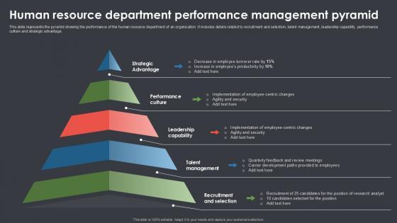 This slide represents the pyramid showing the performance of the human resource department of an organization. It includes details related to recruitment and selection, talent management, leadership capability, performance culture and strategic advantage. Persuade your audience using this Human Resource Department Performance Management Pyramid Clipart PDF. This PPT design covers five stages, thus making it a great tool to use. It also caters to a variety of topics including Talent Management, Recruitment And Selection, Leadership Capability. Download this PPT design now to present a convincing pitch that not only emphasizes the topic but also showcases your presentation skills.