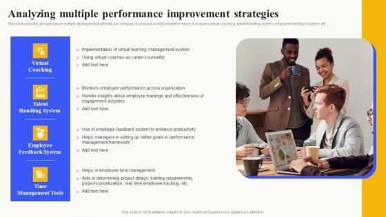 This slide provides glimpse about multiple strategies that will help our company to improve workforce performance. It includes virtual coaching, talent handling system, employee feedback system, etc.Boost your pitch with our creative Analyzing Multiple Performance Planned Workforce Enhancement Introduction Pdf. Deliver an awe-inspiring pitch that will mesmerize everyone. Using these presentation templates you will surely catch everyones attention. You can browse the ppts collection on our website. We have researchers who are experts at creating the right content for the templates. So you do not have to invest time in any additional work. Just grab the template now and use them. This slide provides glimpse about multiple strategies that will help our company to improve workforce performance. It includes virtual coaching, talent handling system, employee feedback system, etc.