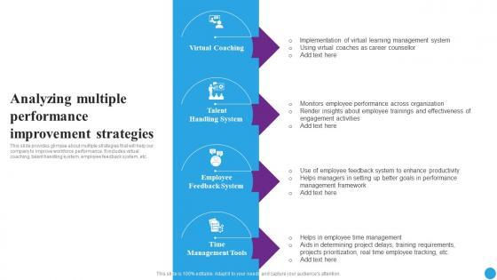 This slide provides glimpse about multiple strategies that will help our company to improve workforce performance. It includes virtual coaching, talent handling system, employee feedback system, etc.Boost your pitch with our creative Analyzing Multiple Performance Strategic Approaches To Streamline Designs Pdf. Deliver an awe-inspiring pitch that will mesmerize everyone. Using these presentation templates you will surely catch everyones attention. You can browse the ppts collection on our website. We have researchers who are experts at creating the right content for the templates. So you do not have to invest time in any additional work. Just grab the template now and use them. This slide provides glimpse about multiple strategies that will help our company to improve workforce performance. It includes virtual coaching, talent handling system, employee feedback system, etc.