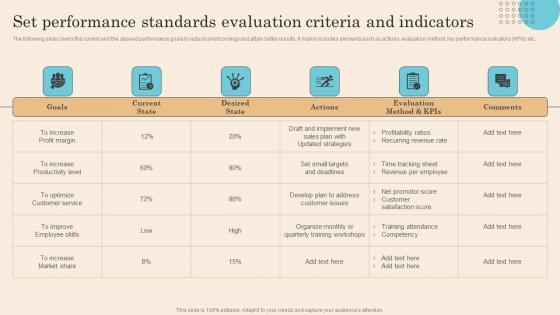 The following slide covers the current and the desired performance goals to reduce shortcomings and attain better results. It mainly includes elements such as actions, evaluation method, key performance indicators KPIs etc. Take your projects to the next level with our ultimate collection of Set Performance Standards Evaluation Criteria And Indicators Employee Performance Management Designs PDF. Slidegeeks has designed a range of layouts that are perfect for representing task or activity duration, keeping track of all your deadlines at a glance. Tailor these designs to your exact needs and give them a truly corporate look with your own brand colors they all make your projects stand out from the rest.