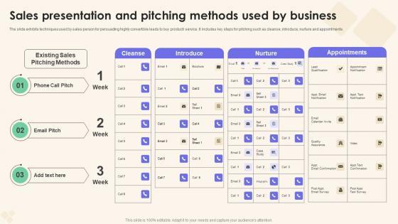 The slide exhibits techniques used by sales person for persuading highly convertible leads to buy product or service. It includes key steps for pitching such as cleanse, introduce, nurture and appointments. Do you have to make sure that everyone on your team knows about any specific topic I yes, then you should give Process Enhancement Plan To Boost Sales Performance Sales Presentation And Pitching Methods Used By Business Rules PDF a try. Our experts have put a lot of knowledge and effort into creating this impeccable Process Enhancement Plan To Boost Sales Performance Sales Presentation And Pitching Methods Used By Business Rules PDF. You can use this template for your upcoming presentations, as the slides are perfect to represent even the tiniest detail. You can download these templates from the Slidegeeks website and these are easy to edit. So grab these today.