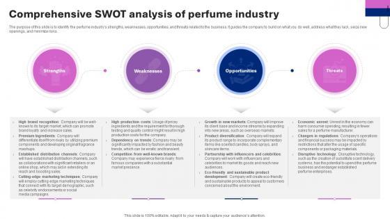 The purpose of this slide is to identify the perfume industrys strengths, weaknesses, opportunities, and threats related to the business. It guides the company to build on what you do well, address what they lack, seize new openings, and minimize risks. Do you have to make sure that everyone on your team knows about any specific topic I yes, then you should give Perfume Manufacturing Business Plan Comprehensive Swot Analysis Of Perfume Industry BP SS V a try. Our experts have put a lot of knowledge and effort into creating this impeccable Perfume Manufacturing Business Plan Comprehensive Swot Analysis Of Perfume Industry BP SS V. You can use this template for your upcoming presentations, as the slides are perfect to represent even the tiniest detail. You can download these templates from the Slidegeeks website and these are easy to edit. So grab these today The purpose of this slide is to identify the perfume industrys strengths, weaknesses, opportunities, and threats related to the business. It guides the company to build on what you do well, address what they lack, seize new openings, and minimize risks.