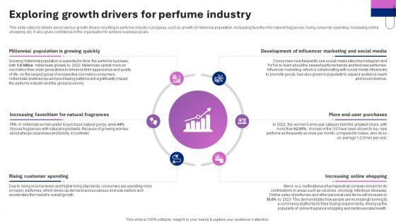 This slide caters to details about various growth drivers resulting in perfume industrys progress, such as growth of millennial population, increasing favoritism for natural fragrances, rising consumer spending, increasing online shopping, etc. It also gives confidence in the organization to achieve business goals. Whether you have daily or monthly meetings, a brilliant presentation is necessary. Perfume Manufacturing Business Plan Exploring Growth Drivers For Perfume Industry BP SS V can be your best option for delivering a presentation. Represent everything in detail using Perfume Manufacturing Business Plan Exploring Growth Drivers For Perfume Industry BP SS V and make yourself stand out in meetings. The template is versatile and follows a structure that will cater to your requirements. All the templates prepared by Slidegeeks are easy to download and edit. Our research experts have taken care of the corporate themes as well. So, give it a try and see the results. This slide caters to details about various growth drivers resulting in perfume industrys progress, such as growth of millennial population, increasing favoritism for natural fragrances, rising consumer spending, increasing online shopping, etc. It also gives confidence in the organization to achieve business goals.
