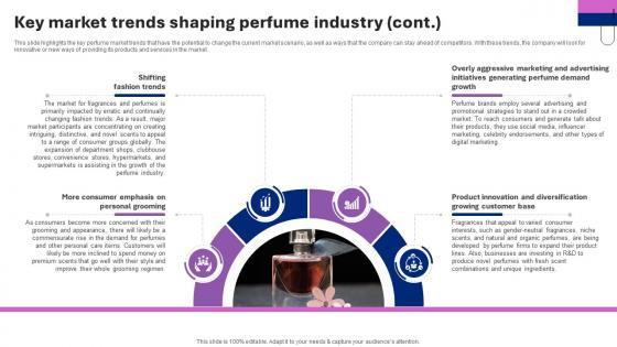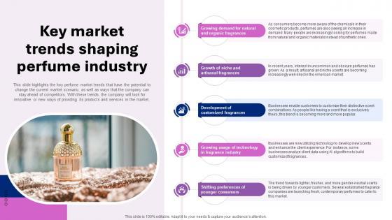 This slide highlights the key perfume market trends that have the potential to change the current market scenario, as well as ways that the company can stay ahead of competitors. With these trends, the company will look for innovative or new ways of providing its products and services in the market. Make sure to capture your audiences attention in your business displays with our gratis customizable Perfume Manufacturing Business Plan Key Market Trends Shaping Perfume Industry BP SS V. These are great for business strategies, office conferences, capital raising or task suggestions. If you desire to acquire more customers for your tech business and ensure they stay satisfied, create your own sales presentation with these plain slides. This slide highlights the key perfume market trends that have the potential to change the current market scenario, as well as ways that the company can stay ahead of competitors. With these trends, the company will look for innovative or new ways of providing its products and services in the market.