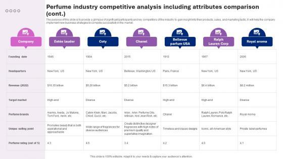 The purpose of this slide is to provide a glimpse of significant participants and key competitors of the industry to gain insight into their products, sales, and marketing tactic. It will help the company implement new business strategies to compete successfully in the market. Explore a selection of the finest Perfume Manufacturing Business Plan Perfume Industry Competitive Analysis Including BP SS V here. With a plethora of professionally designed and pre-made slide templates, you can quickly and easily find the right one for your upcoming presentation. You can use our Perfume Manufacturing Business Plan Perfume Industry Competitive Analysis Including BP SS V to effectively convey your message to a wider audience. Slidegeeks has done a lot of research before preparing these presentation templates. The content can be personalized and the slides are highly editable. Grab templates today from Slidegeeks. The purpose of this slide is to provide a glimpse of significant participants and key competitors of the industry to gain insight into their products, sales, and marketing tactic. It will help the company implement new business strategies to compete successfully in the market.